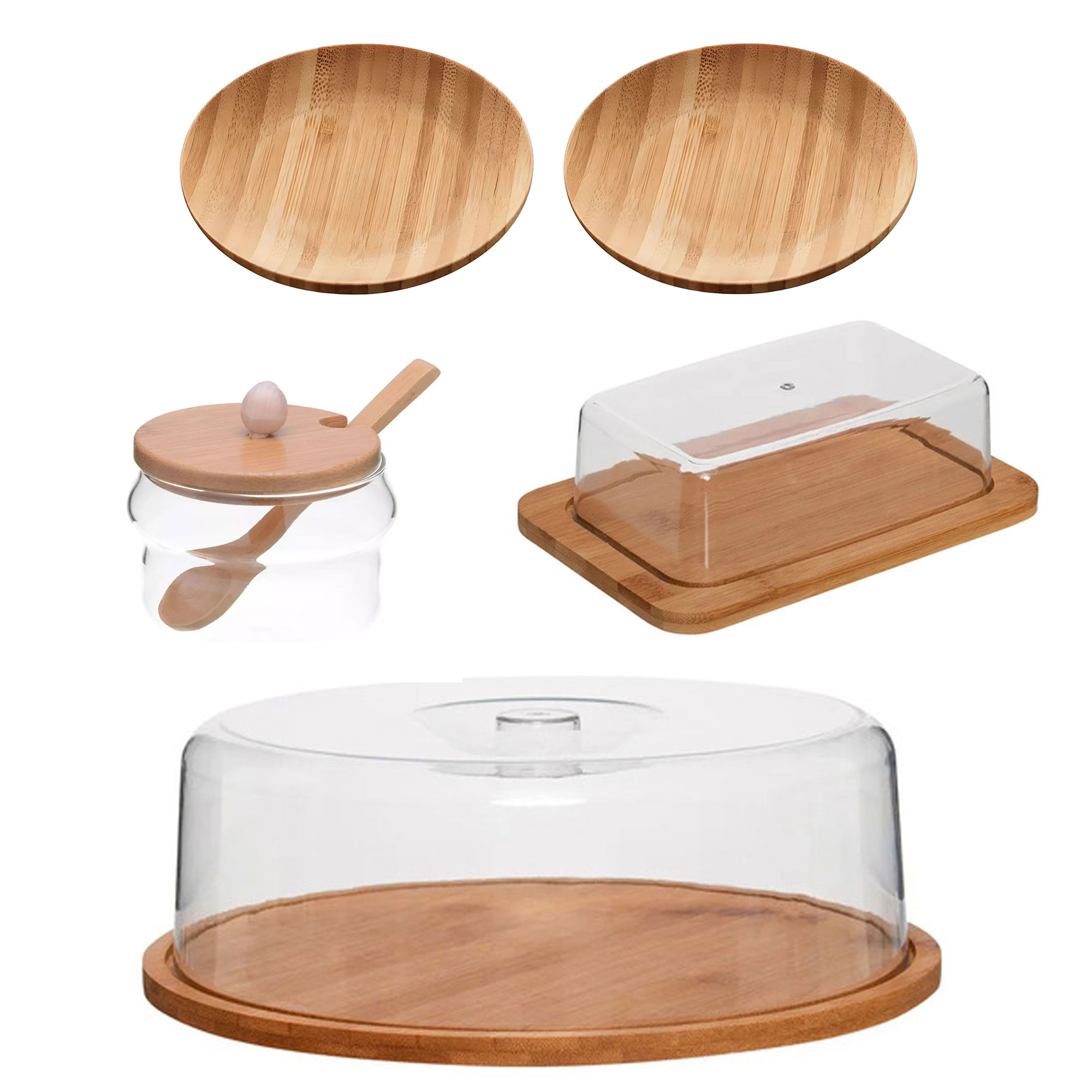 Kit Porta Manteiga + Porta Bolo + 2 Pratos de Bambu e Açucareiro